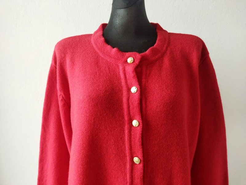 Dobrej jakości rozpinany sweter typu kardigan w kolorze nasyconej czerwieni. Z dwiema naszywanymi kieszeniami. zapinany na ozdobne grawerowane guziki w złotym kolorze. wykończony ściągączami