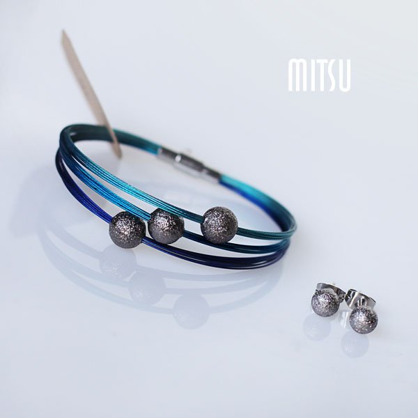 Bransoleta zbudowana ze stalowych linek krytych nylonem w kolorach kobaltowy,turkusowy,lazurowy. Ozdobiona metalowymi , teksturowanymi kulkami w kolorze ciemnego srebra, Rozmiar S: 18 cm Bransoleta jest zapinana na magnes i blokadę. Nowoczesny i elegancki charakter. Opakowanie hand made. W komplecie delikatne kolczyki wkrętki kulki wielkości 6mm