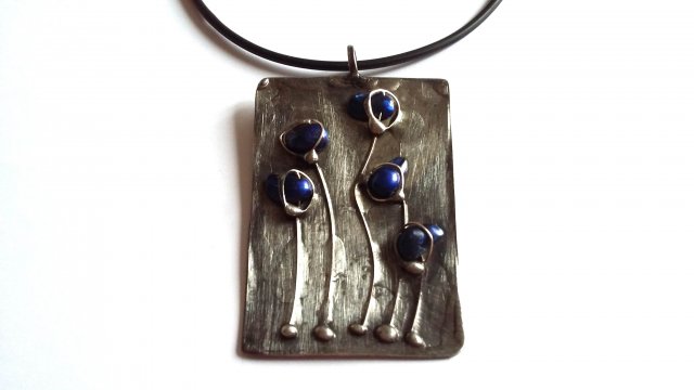 Wisiorek wykonany z miedzi, cyny i słodkowodnych pereł. Wymiary ok. 7,5 na 5 cm. Zawieszony na czarnej lince kauczukowej o długości ok. 45 cm.