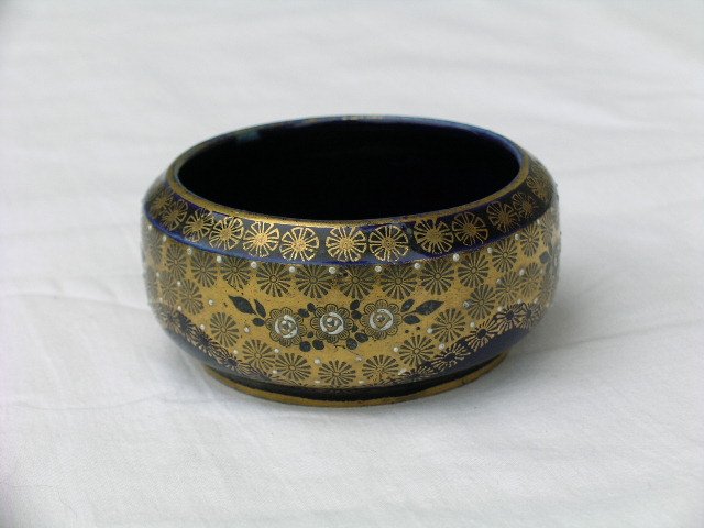 Piękne porcelanowe, grubo szkliwione naczynko buduarowo-łazienkowe. Cudownie eleganckie spotkanie złota z kobaltem i ręcznie domalowywanymi perliście białymi akcentami. Ujmująca koronkowość wzoru. Nie sygnowane, dawnej daty, z duszą. 7,5 x ponad 3 cm. Stan zachowania bardzo dobry.