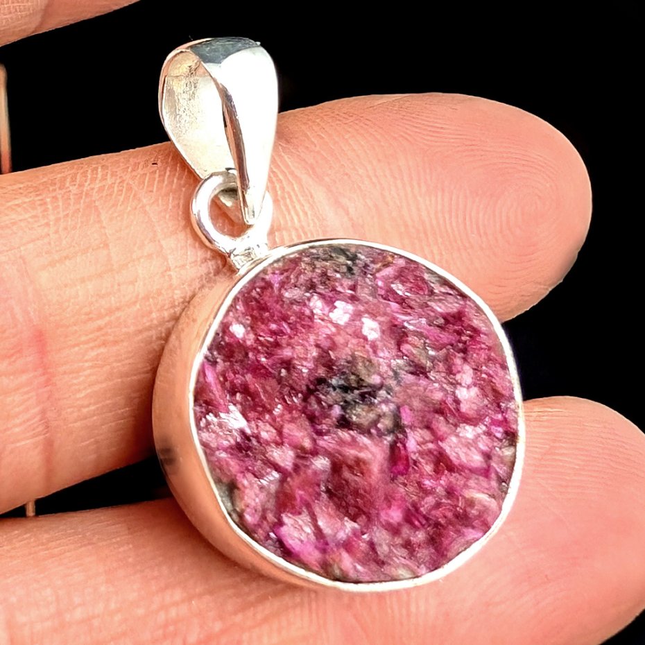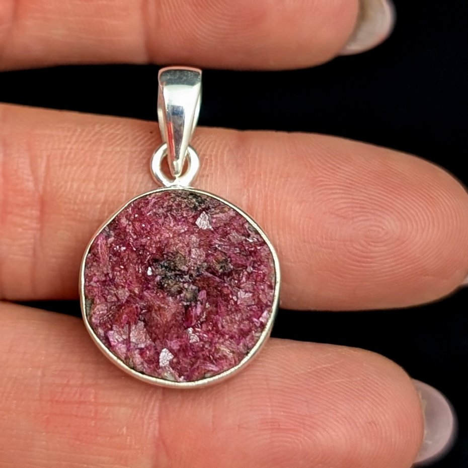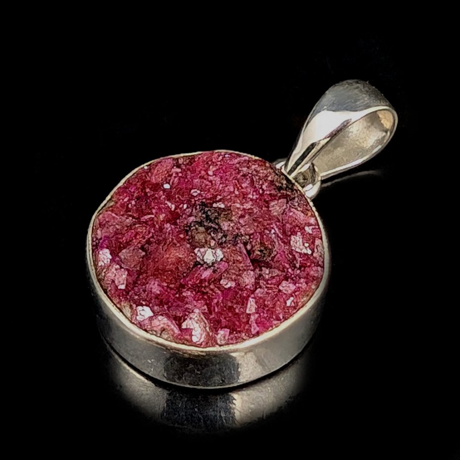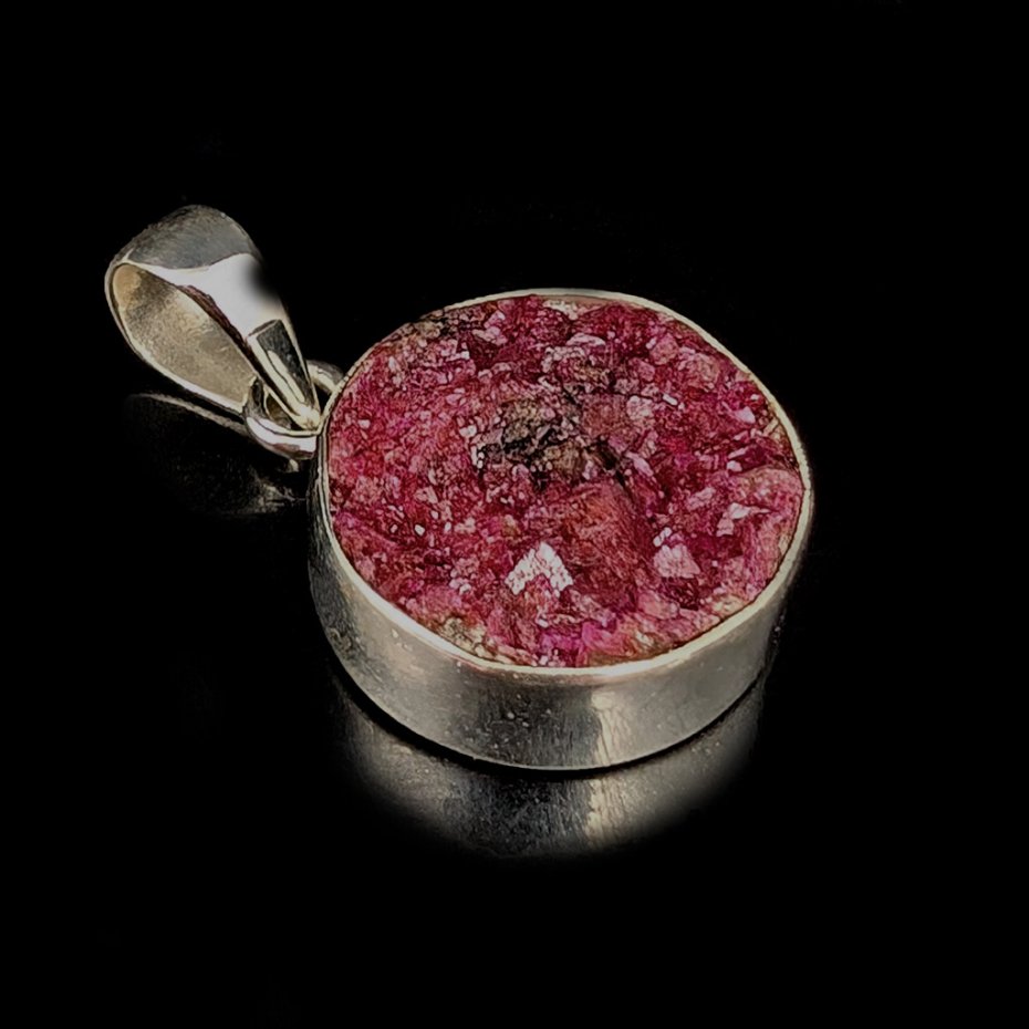 Wisiorek z oprawionym w srebro próby 925 intensywnie różowym kobaltokalcytem o pięknie wykształconych kryształach. Kamień ma oprawę 18 mm. Długość 31 mm. 6 g. Wykonany przez dostawcę kamieni. Zapakowany zostanie w ozdobne pudełeczko.kazuje piękno całego kamienia. Wymiary całej oprawy 42 x 32 mm. Z krawatką 52 mm. Waga 20 g. Zapakowany do wysylki w ozdobne pudełeczko.
