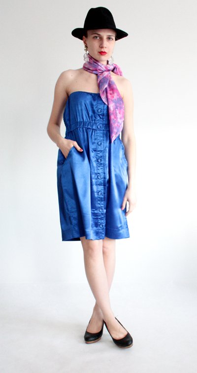 Kobaltowa sukienka bez ramion. Z tyłu wszyte gumki.