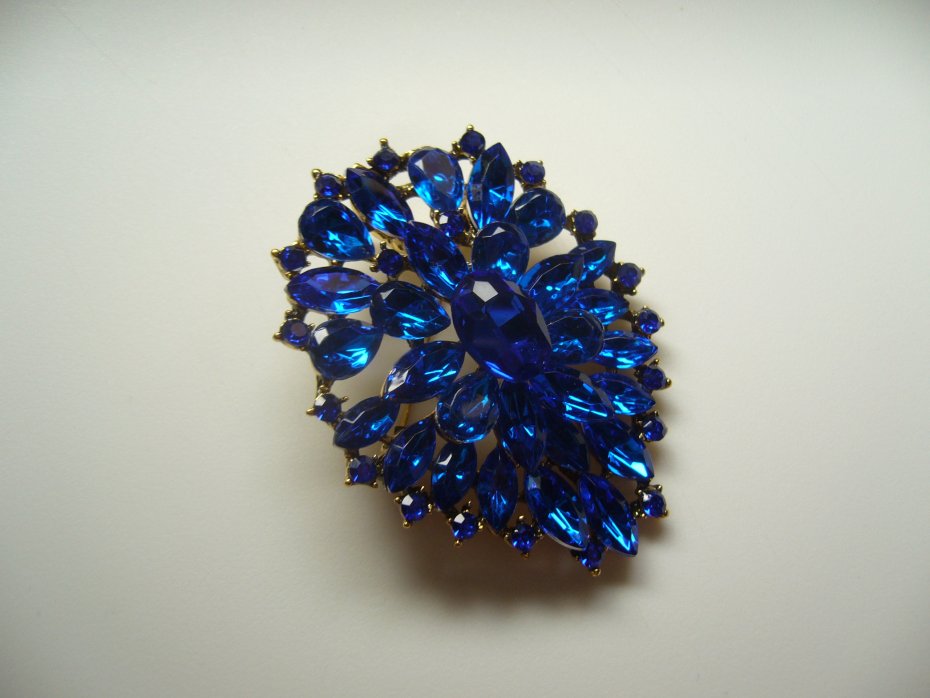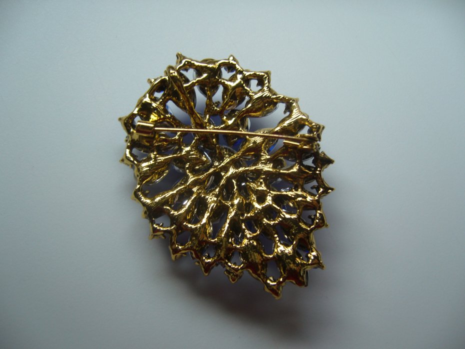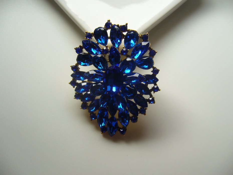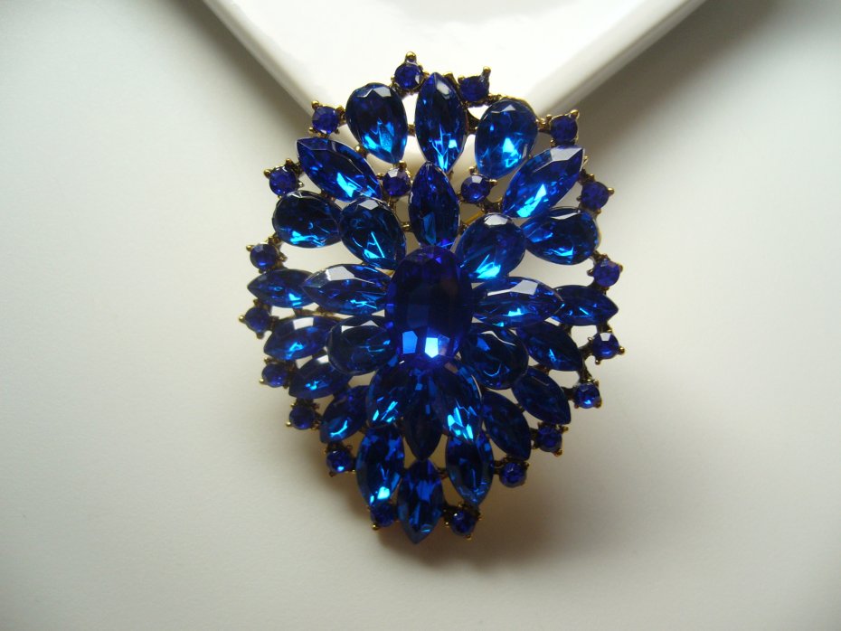 POZŁACANA KRYSZTAŁOWA BROSZA WISIOR W KOLORZE KOBALTOWYM