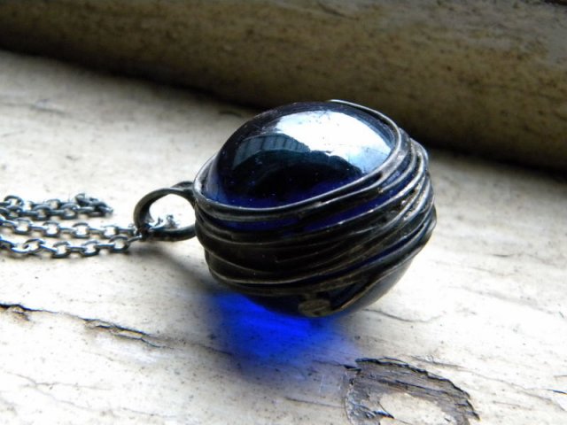 naszyjnik. szklana kula w ocynowanej miedzi. długość 4,4cm. średnica 3,3cm. Łańcuszek z oksydowanej miedzi o długości 93cm. Może zostać skrócony na życzenie.