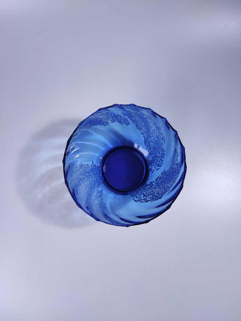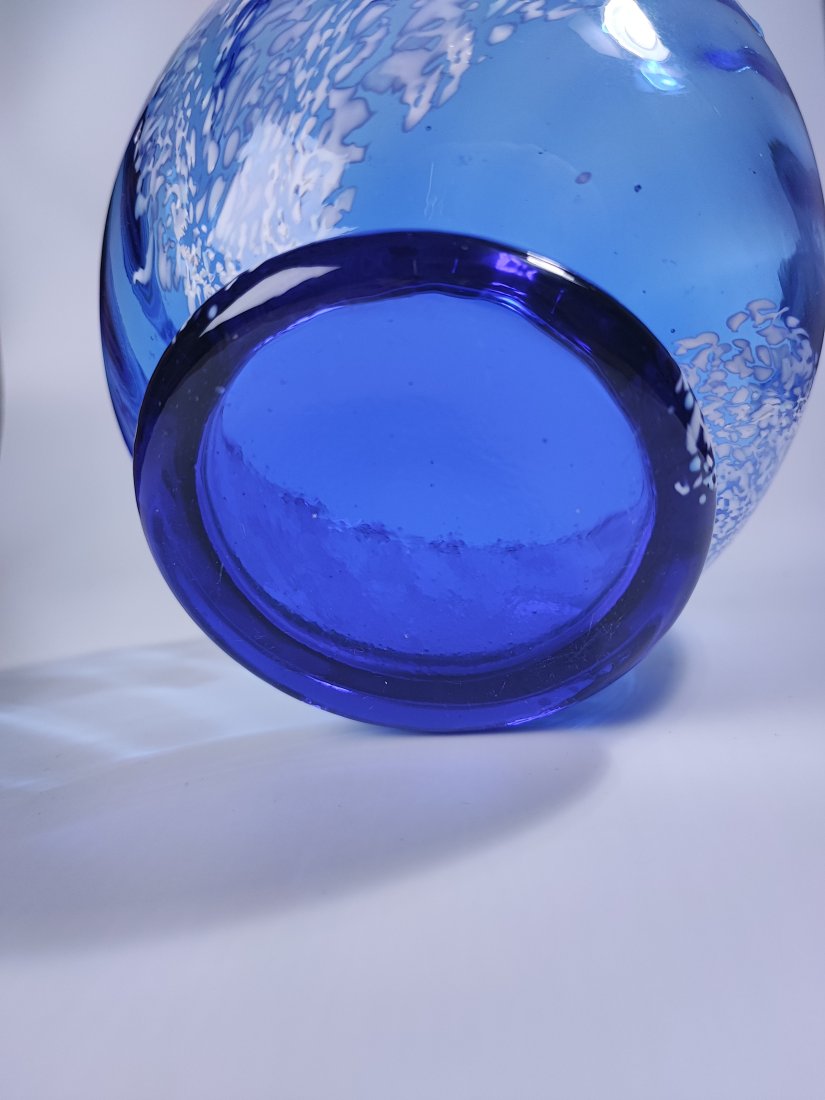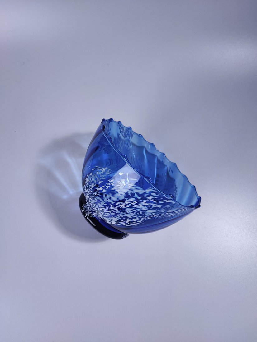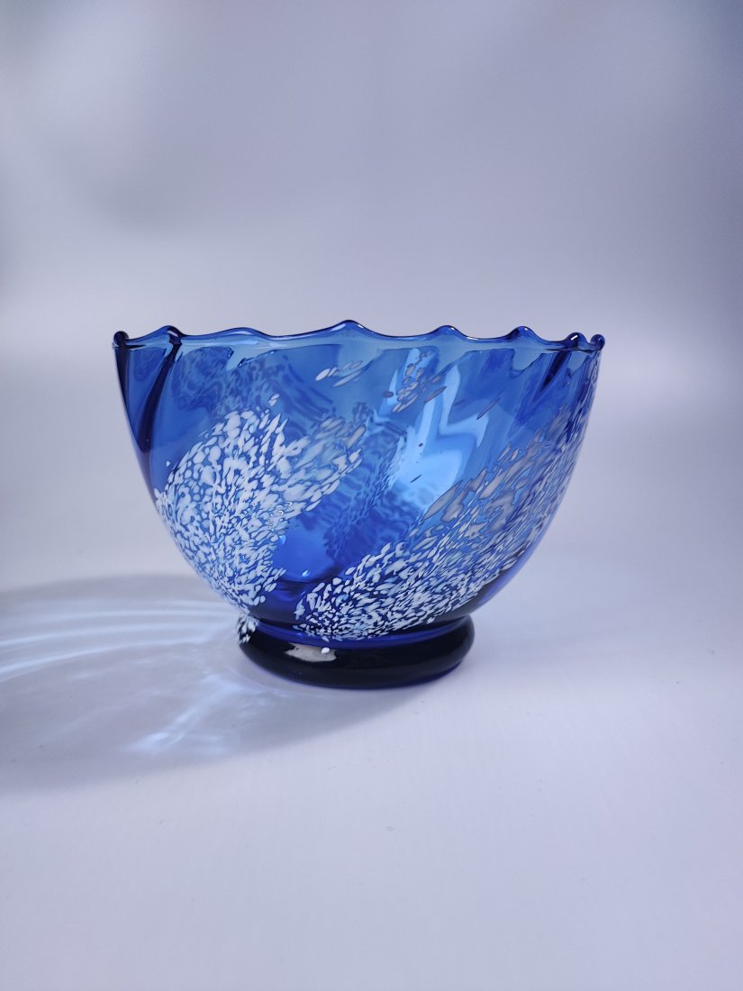 Dekoracyjna misa ze szkła barwionego w masie w kolorze głębokiego kobaltu, z białymi wtopieniami. Forma ręcznie modelowana z falowanym rantem, osadzona na niskiej stopie. Styl charakterystyczny dla szkła dekoracyjnego z okresu PRL.
