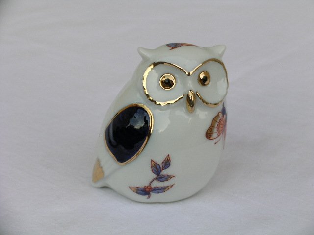 Porcelanowa figurka sowia, która, jak biżuterię, kobalt, złoto i orientalny pomarańcz na sobie nosi. Inspirowana orientalnie, oszczędnie a zjawiskowo elegancka :) Oczywiście ręcznie malowana, na błyszcząco szkliwiona. Pusta od środka = od spodu dziurka. 5,5 x 5 x 6 cm. Stan zachowania bardzo dobry. Prawdziwe cudo.