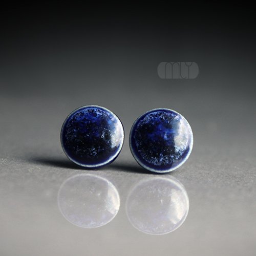Ceramiczne kolczyki w formie sztyftów, ręcznie wykonane z delikatnej gliny kamionkowej, jednostronnie szkliwione granatowo błękitnym szkliwem z efektem plamek, na antyalergicznych sztyftach w kolorze srebrnym. Średnica ok. 9mm.Polecam