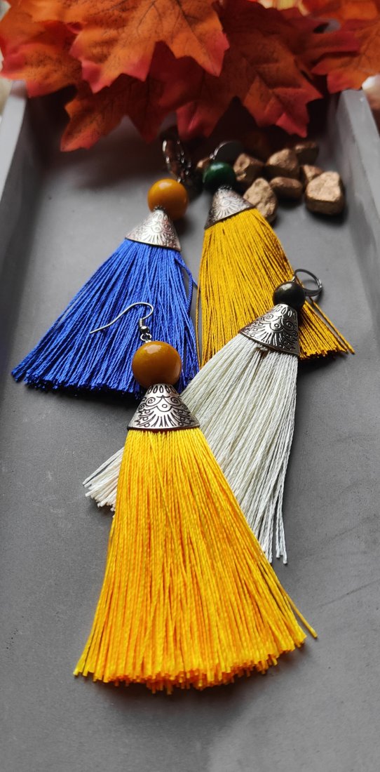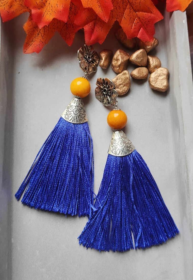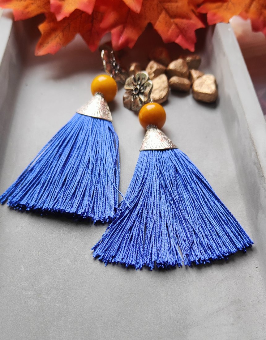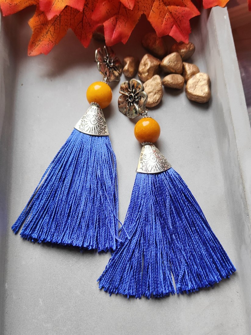 ,, kobaltowe frędzle,, to długie kolczyki wykonane z kobaltowego chwosta i nefrytu. Kolczyki zawieszone są na ozdobnych biglach typu sztyft.