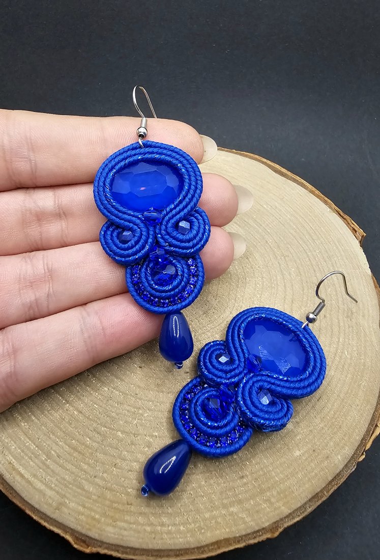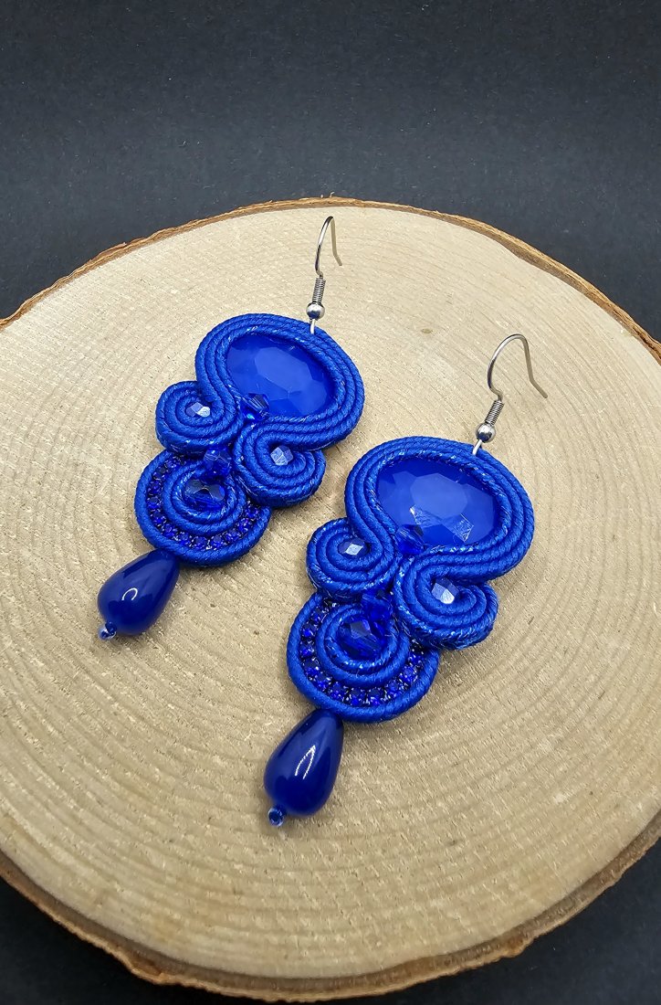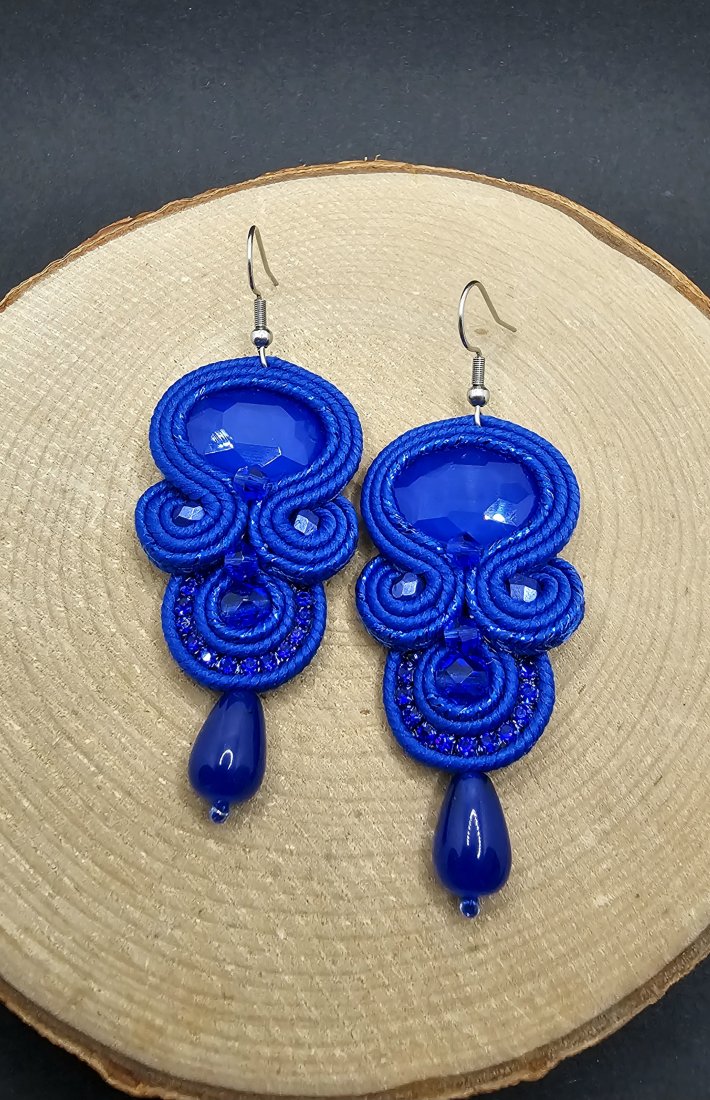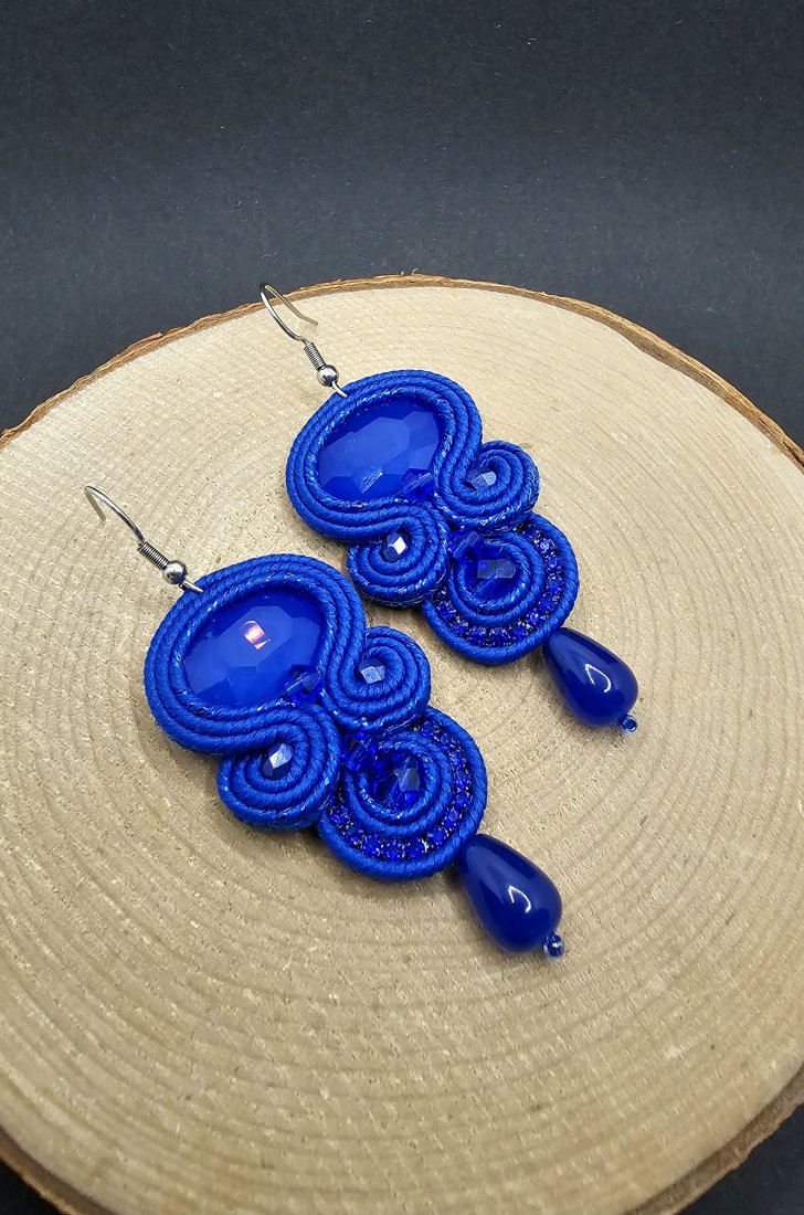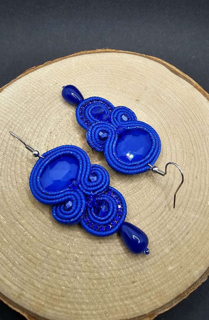 Kobaltowe fasetowane kryształki otoczone polskimi sznurkami sutasz oraz szklanymi koralikami o różnych wielkościach. Dopełnieniem kryształków jest mieniąca się taśma cyrkoniowa, która nadaje kolczykom blasku. Dół kolczyków zakończony kroplami jadeitu. Kolczyki zawieszone na klasycznych biglach wykonanych ze stali chirurgicznej.