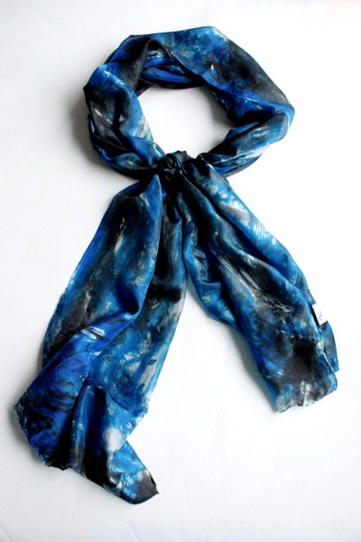 Wspaniały, nietypowy szal wykonany ze stuprocentowego jedwabiu w pięknie połączone odcienie głębokiego kobaltu i czerni.