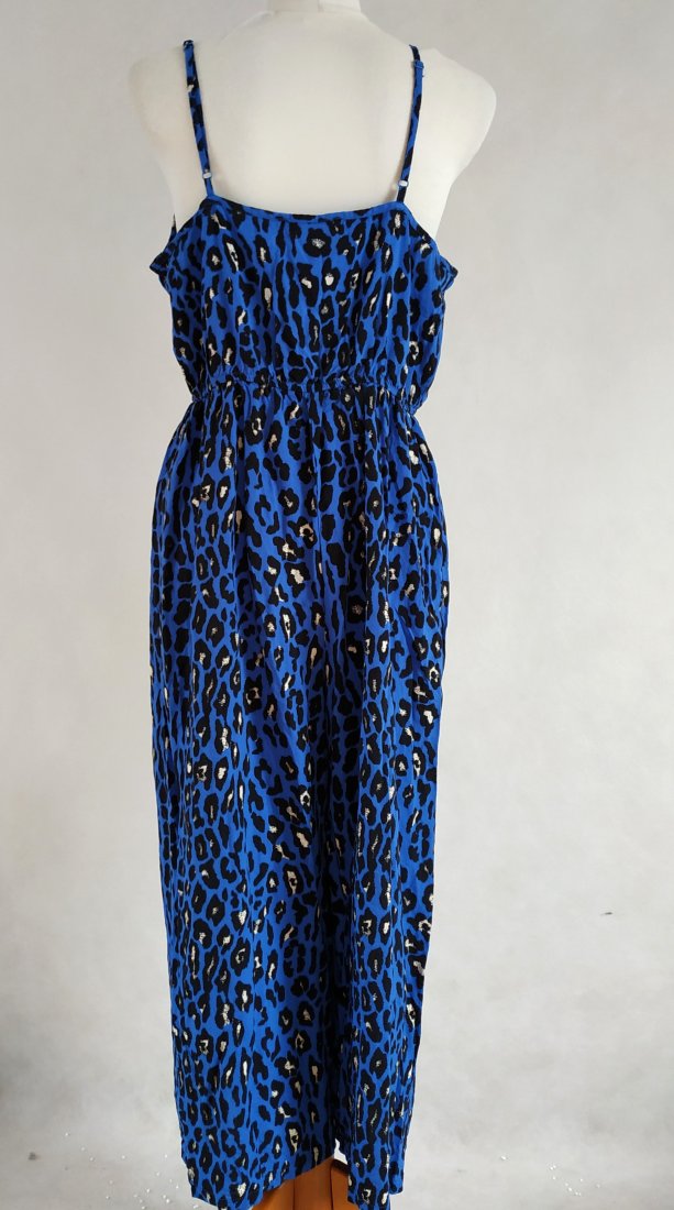kolor kobaltowy, czarne cętki z jasno beżowymi akcentami. ramiona regulowane, w pasie gumka, luźne spodnie. wygodny, super na wakacje, upały...