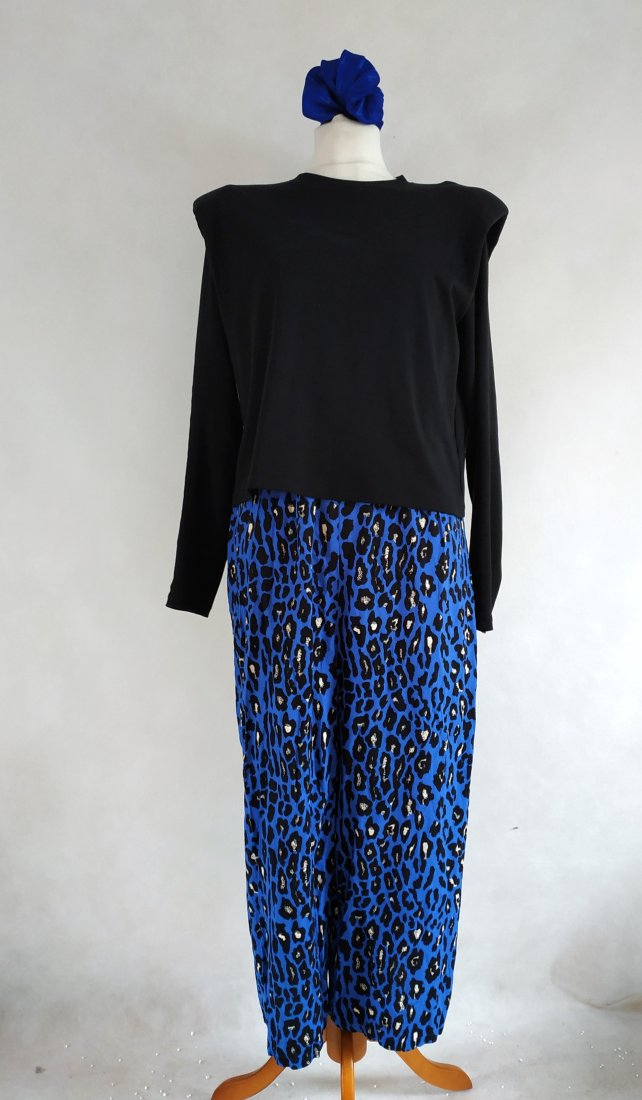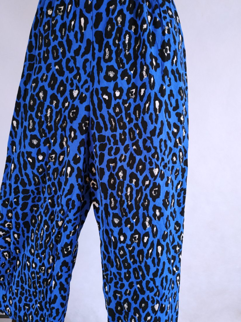kolor kobaltowy, czarne cętki z jasno beżowymi akcentami. ramiona regulowane, w pasie gumka, luźne spodnie. wygodny, super na wakacje, upały...