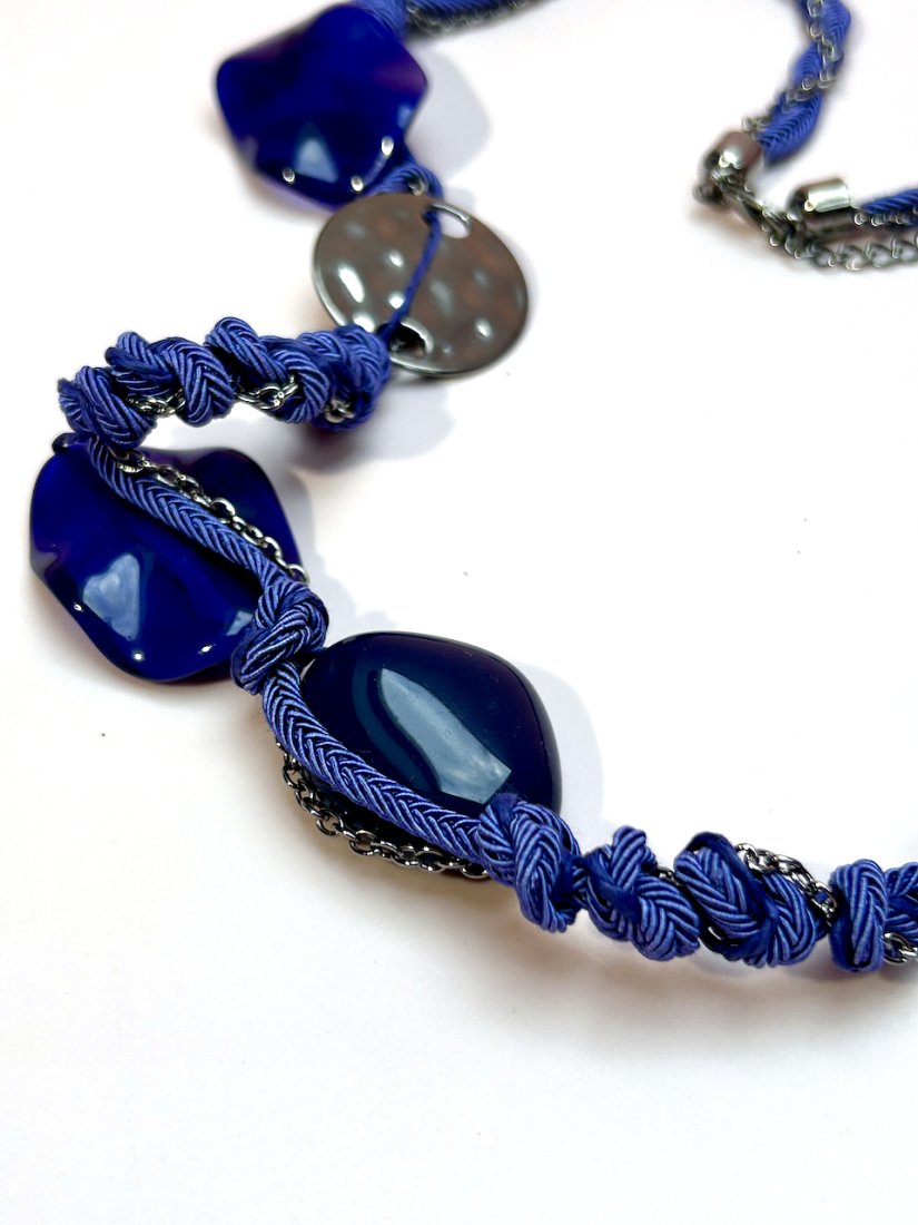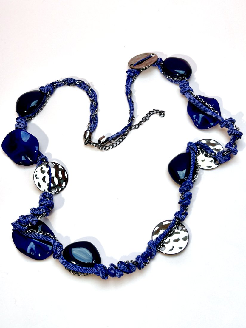 Pięknie zaprojektowany naszyjnik, wykonany z jedwabistego sznureczka w kolorze delikatnego kobaltu. Ozdobiony łańcuszkiem oksydowanym oraz nieregularnymi kamykami, talerzykami i owalami.