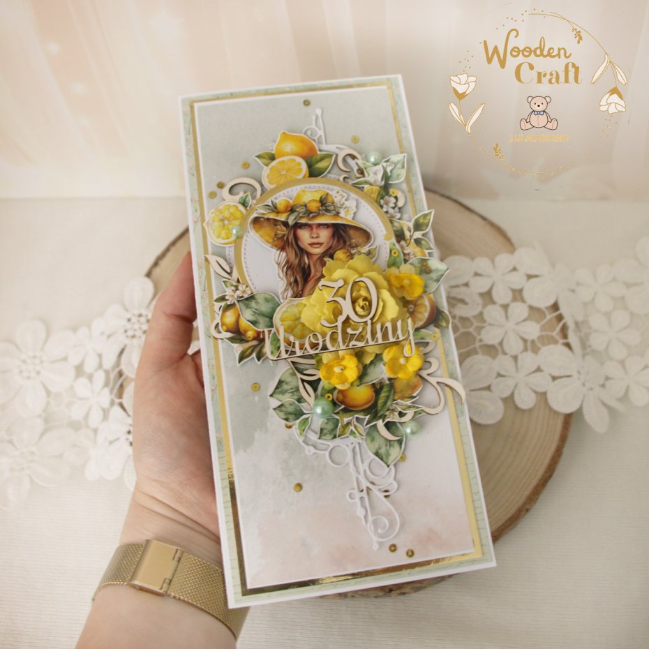 Piękna i nietuzinkowa kartka urodzinowa dla kobiety, utrzymana w odcieniach jasnej zieleni, cytryny i bieli, z dodatkiem złotych błyszczących akcentów, bogato zdobiona licznymi grafikami cytryn oraz kobiety w kapeluszu, udekorowana ręcznie robioną foamiranową różą, a także połyskującymi, złotymi cekinami oraz tekturkowym napisem "30 Urodziny".