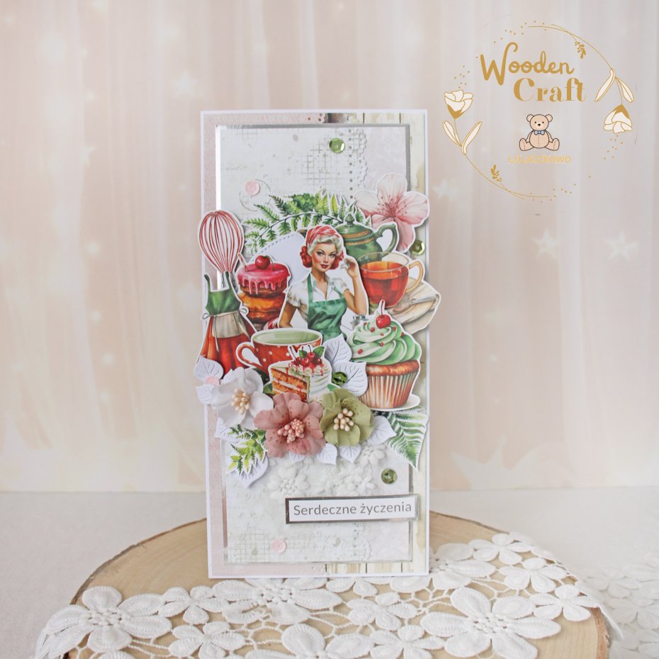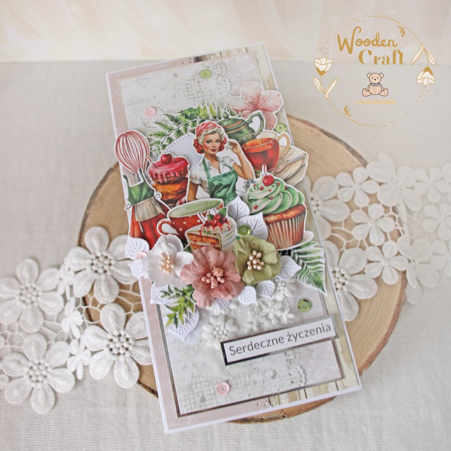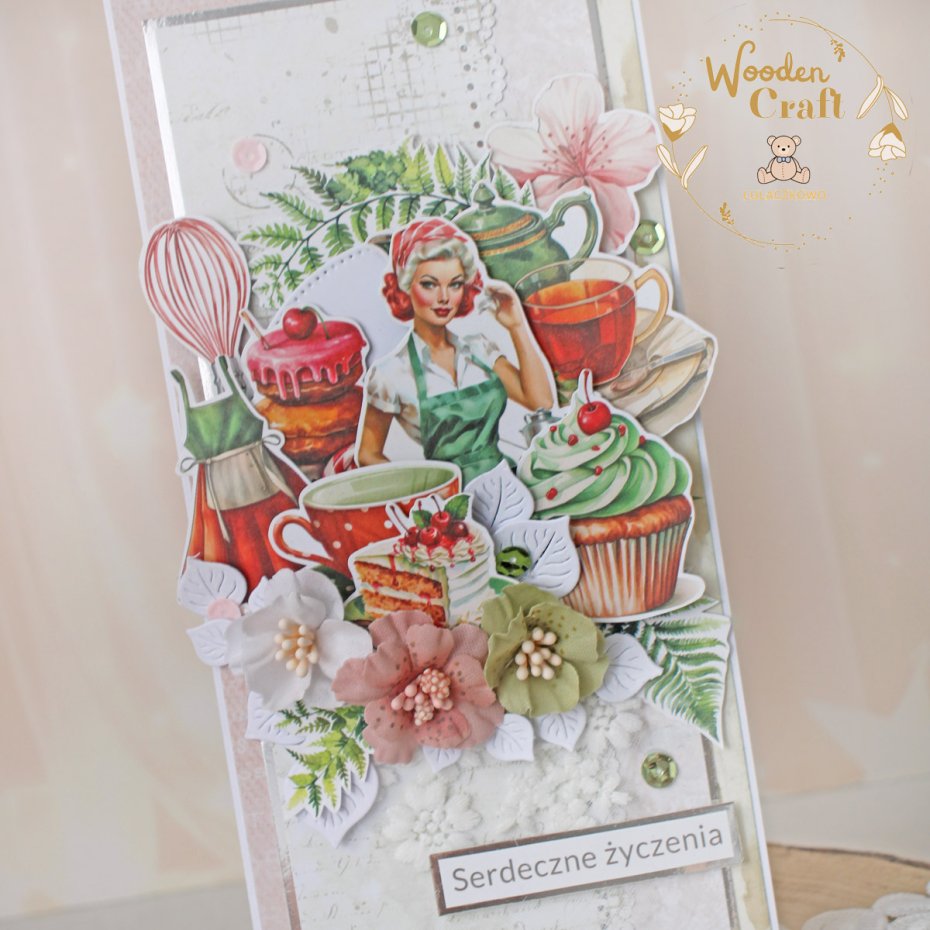 Rewelacyjna, nietuzinkowa kartka urodzinowa dla kobiety, utrzymana w odcieniach beżu, bladego różu i bieli, z dodatkiem srebrnych błyszczących akcentów, z motywem kuchennym. Bogato zdobiona licznymi grafikami związanymi z kuchnią, udekorowana ręcznie robionymi, materiałowymi kwiatami, a także połyskującymi cekinami oraz napisem "Serdeczne Życzenia".