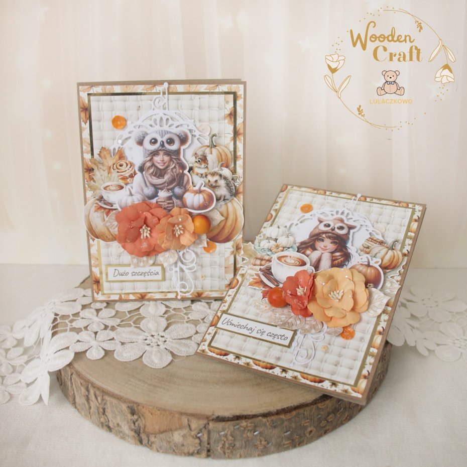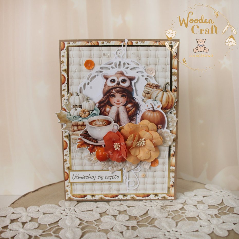 Piękna i nietuzinkowa, bogato zdobiona kartka urodzinowa dla kobiety - z motywem jesiennym. Utrzymana w odcieniach beżu, brązu, bieli i pomarańczu, z dodatkiem złotych błyszczących akcentów, z grafiką pięknej dziewczyny ubranej w ciepły sweterek i czapkę, otoczoną kompozycją z dyń, gorącej herbatki, książek i kocyka, a także papierowych kwiatów. Kartka ozdobiona cekinami, połyskującymi drobinkami oraz napisem "Uśmiechaj się często" (na życzenie napis mogę zmienić na dowolny).