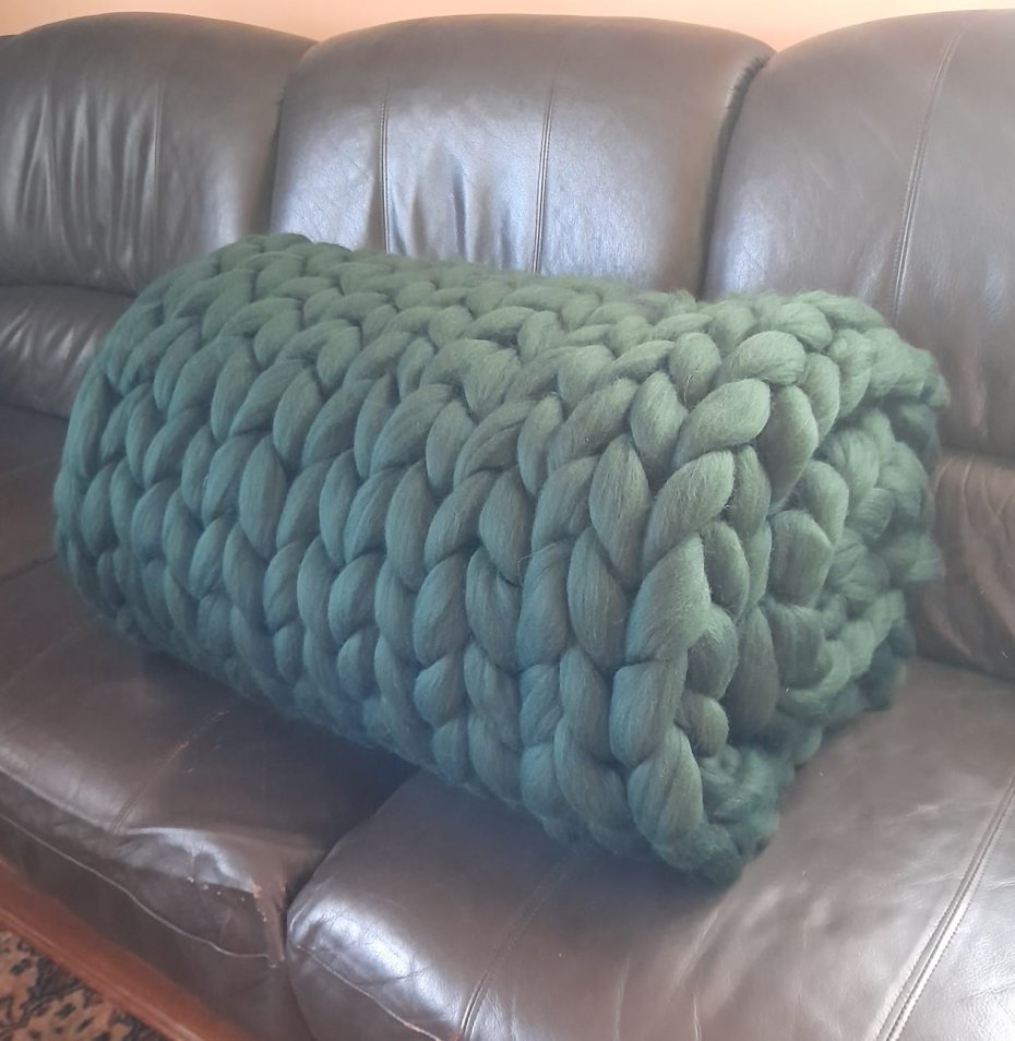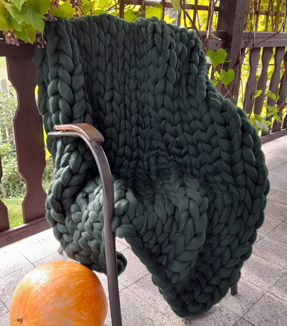 Wymiary: 120 cm x 180 cm. Kolor zieleń butelkowa. Skład: 100 % wełna owcza z merynosa wyłącznie od polskich producentów.