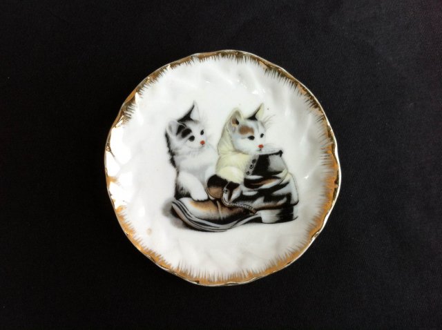Porcelanowy talerzyk, także do powieszenia. Z uroczym kocim obrazkiem, na błyszcząco szkliwiony, z delikatnym ryflowaniem i złoceniem na obrzeżu. Nie sygnowany. Z tyłu dziurki do powieszenia. 10,5 x 1,5 cm. Stan zachowania bardzo dobry.