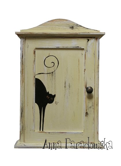 Drewniana szafka na klucze z kotem, ręcznie pomalowana farbami akrylowymi (specjalna technika), zabezpieczona lakierem półmatowym. Szafka posiada w środku dwa rzędy wieszaczków na klucze. Mocowanie do ściany na kołki.
