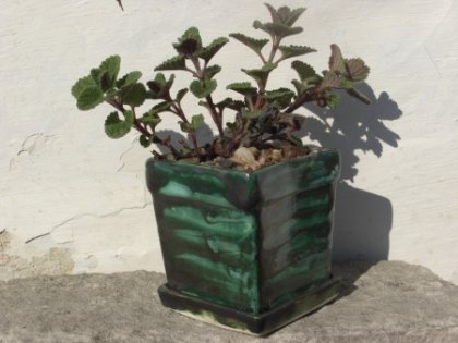Sadzonka kocimiętki w doniczce z dziurką i podstawką. Szlachetna masa ceramiczna, odlew z formy. Szkliwiona zielono cynowym, metalicznym szkliwem. Góra 6, dół 5 cm; wysokość z podstawką 6,5 cm. Początek serii ziołowych sadzonek w doniczkach :)