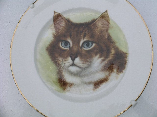 Talerzyk śniadaniowy i dekoracyjny, ze szlachetnej porcelany, na jedwabiście błyszcząco szkliwiony i ze złoconym rantem. Koci portret fantastyczny :) 21 x 1,5 cm. Stan zachowania bardzo dobry minus. Z tyłu profesjonalny uchwyt do powieszenia.
