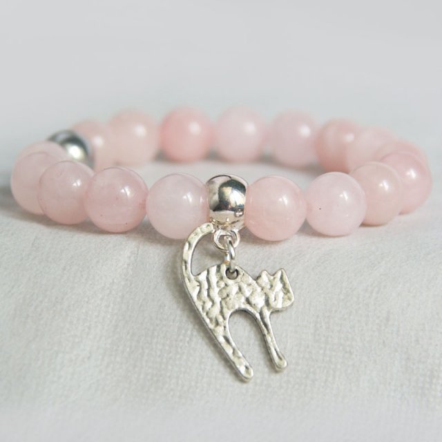 delikatna a zarazem efektowna bransoletka z dedykacją dla kotolubnych ;) ... na podwójnej lince elastycznej, wykonana z różowego kwarcu (10mm) oraz metalowych elementów..... KWARC - działa jako odpromiennik, skutecznie neutralizuje negatywne promieniowanie, harmonizuje, oczyszcza i chroni naszą aurę, wnosi jasność i czystość w umysł i duszę, jest niewyczerpanym źródłem energii. pasuje na standardowy nadgarstek 15,5-17cm. BIŻUTERIA ZAWSZE PODRÓŻUJE W OZDOBNYM OPAKOWANIU :-)