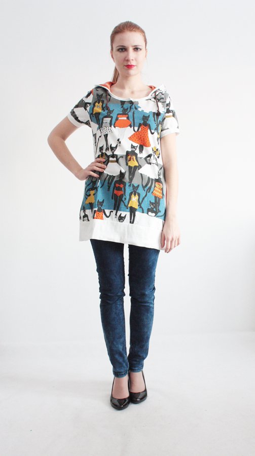 Tunika z kapturem w niezwykłe kocie wzory. Wykonana z bawełny.