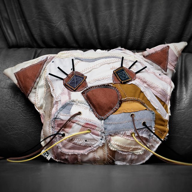 Kociak to mała, mięciutka poduszka przytulanka. Wykonany został z przeróżnych skrawków materiałów, wąsiki z rzemyka. Kociak ma wymiary ok. 23 na 24 cm (bez uszów).