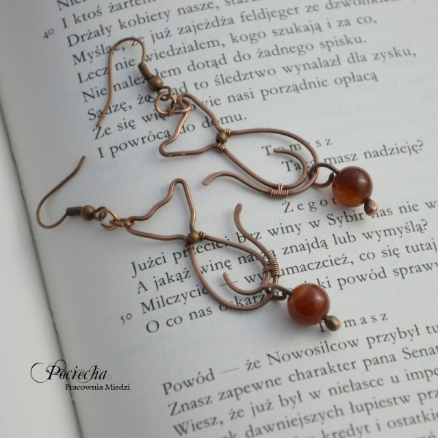 Kolczyki mają bigle antyalergiczne w kolorze miedzi antycznej. Miedź patynowana na antyczny kolor i polerowana. Dodatkową ozdobę stanowią piękne kule agatu smoczego o barwie rudej, średnica każdego kamienia to 8 mm.