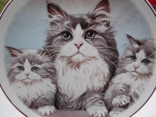 Wielkiej urody Porcelanowy Talerz Kolekcjonerski. Kocia rodzina jako żywa. Piękna malatura, pod dłonią czuje się wręcz kocią sierść. Porcelana szlachetna, dzwięcząca. Wykończenie satynowe - błyszczące i matowe. Niesamowite. Rant złocony.