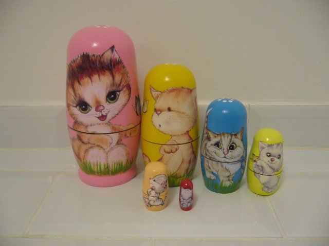 Wymiary : Duży kot wysokość 14,5 cm, drugi kot wysokość 11 cm,trzeci kot wysokość 8 cm , czwarty kot wysokość 5,5 cm,piąty kot wysokość 4 cm , szósty kot nieotwierany wysokość ok.2,5 cm