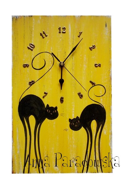 Drewniany zegar ręcznie malowany farbami akrylowymi (specjalna technika), zabezpieczony lakierem półmatowym. Mechanizm wysokiej jakości na paluszek (R6). Gwarancja na mechanizm 12 m-cy. PRACA RĘCZNIE SYGNOWANA, WZÓR CHRONIONY PRAWAMI AUTORSKIMI.