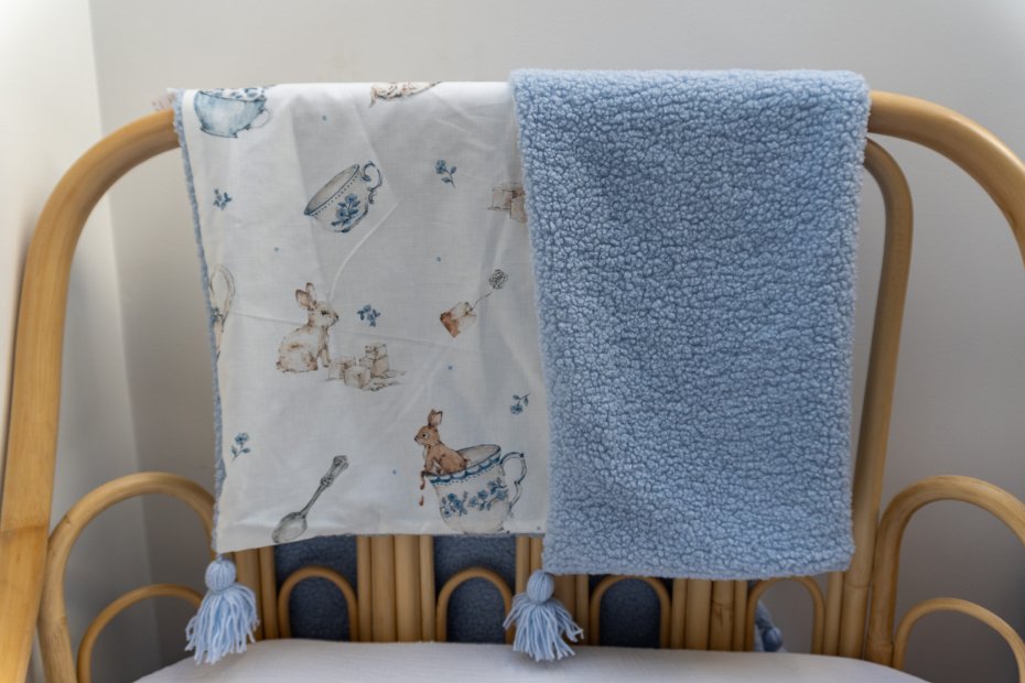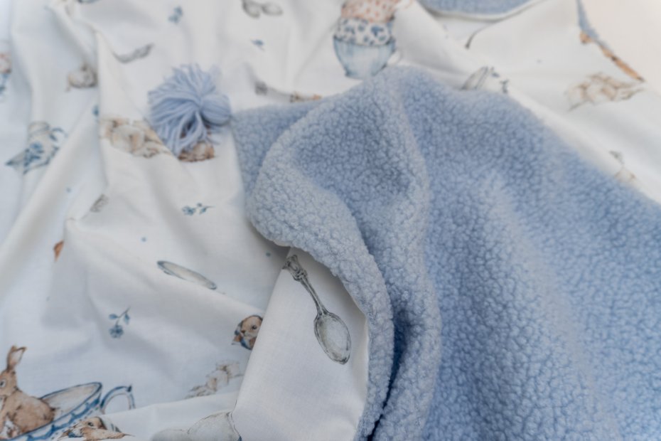 Cieplutki kocyk uszyty z bawełny premium oraz puszystego baranka.
