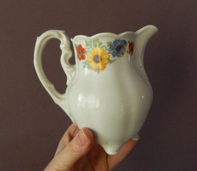 Stary śląski mlecznik, sygnowany Koenigszelt. Biała porcelana z bogatym reliefem, u wylewki zdobiony soczystymi kwiatami. Stan ogólny dobry, bez ubytków ani włosowatych pęknięć, wytarte złocenia.