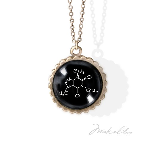 Romantyczny, oryginalny, delikatny zaczarowany naszyjnik z miniaturą wzoru chemicznego kofeiny. Ukryłam go niczym sekret pod szklaną kopułą przeźroczystego szkiełka. Stylowy medalik w kolorze antycznego złota - średnica 2 cm . Wielkość miniatury 16 mm. Medalik zawieszony na łańcuszku długim na 46 cm. Projekt autorski. Wszystkie prawa zastrzeżone.