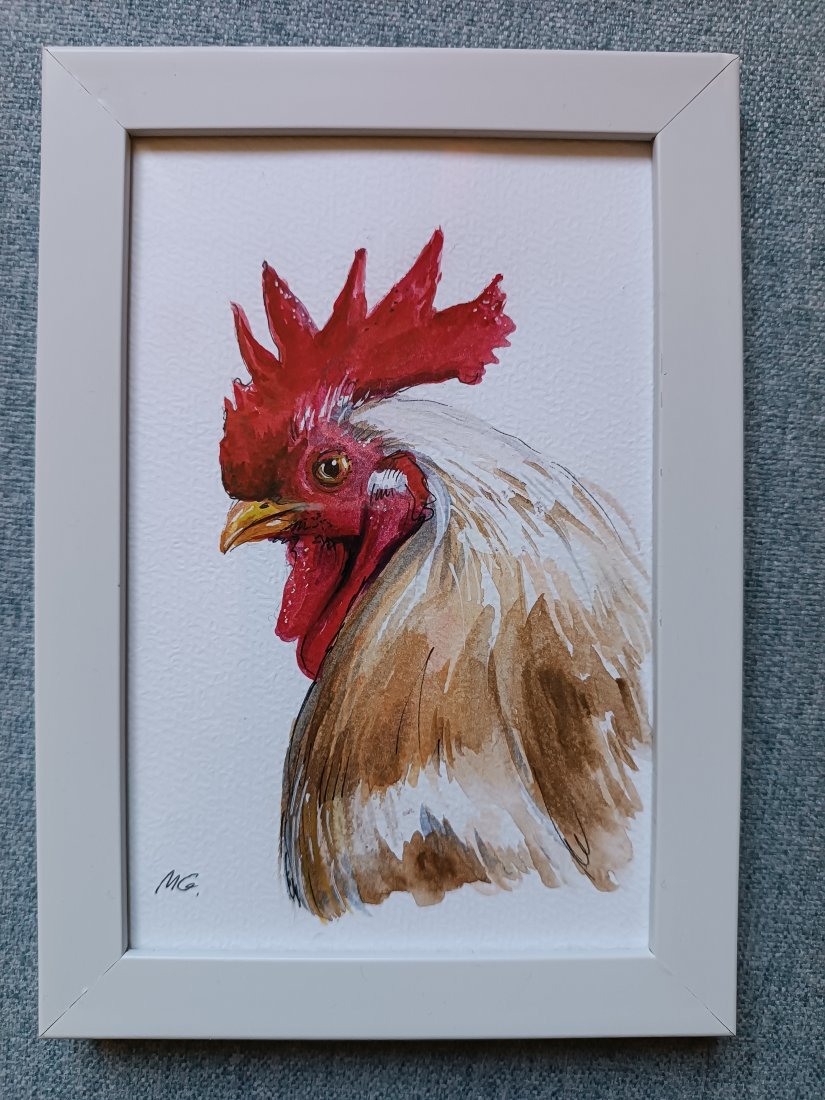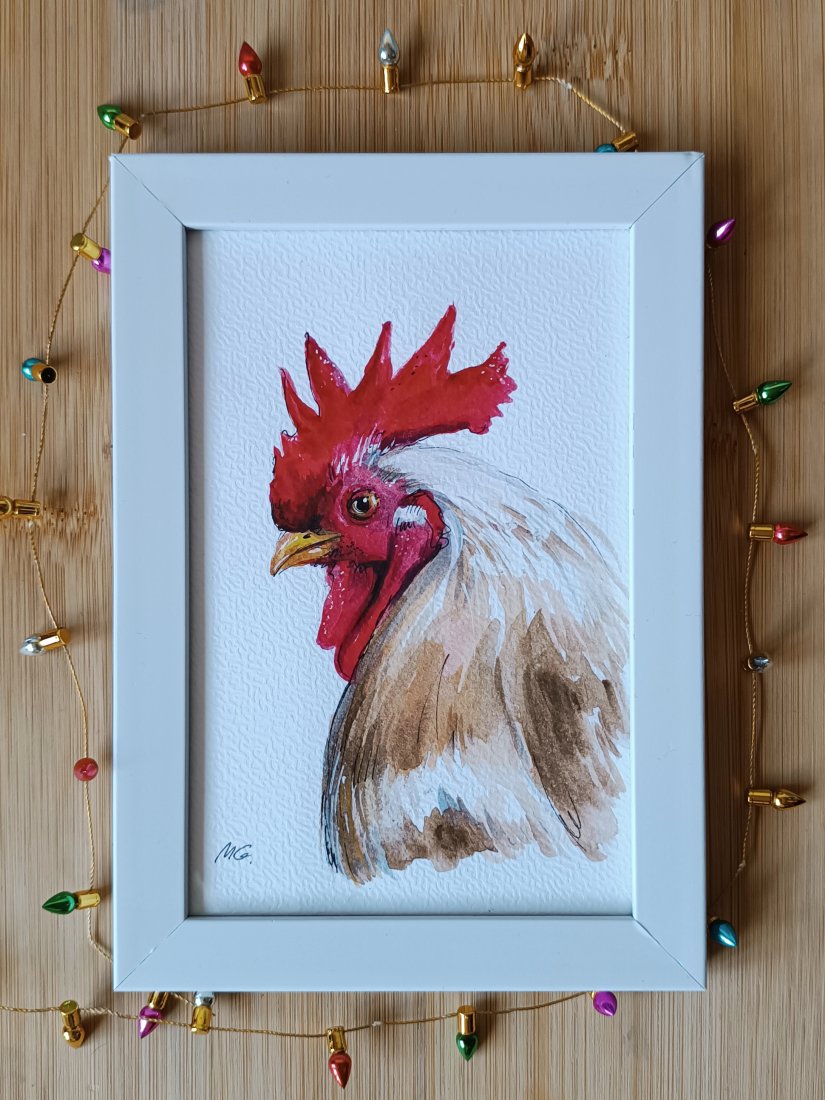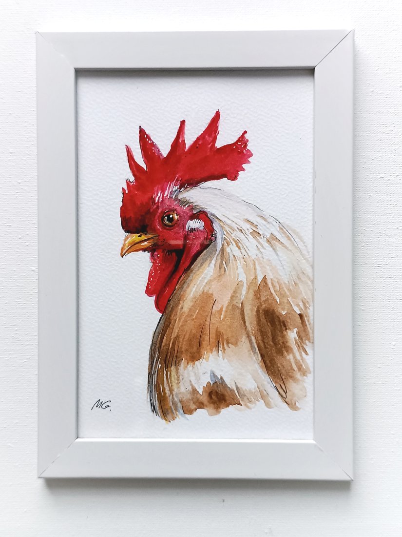 Pan kogut bardzo z siebie zadowolony ;-) "Kogut" ręcznie malowana akwarelka na papierze 300g, farbami i tuszami Derwent, z użyciem cienkopisów Winsor & Newton i gellpenu Sakura. Jest to oryginał, oprawiony w ramkę w kolorze białym, za szkłem. Wymiary całości 12,2 x 17,4cm. Ramka jest przystosowana również do postawienia. Gotowy prezent! Poleca się w duecie z Kurką :-)