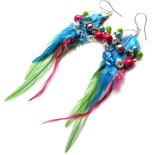 Kolczyki wykonane z turkusowych, bordowych i zielonych piórek koguta. Materiały: piórka, korale neonowe, korale lampwork, perły, srebrne i metalowe przekładki, linka jubilerska i srebrne bigle. Długość piór 14 cm, długość koralików zawieszonych na lince 5 cm. Uwaga!! Wszystkie kolczyki pakuję w bezpieczny sposób. POLECAM :)