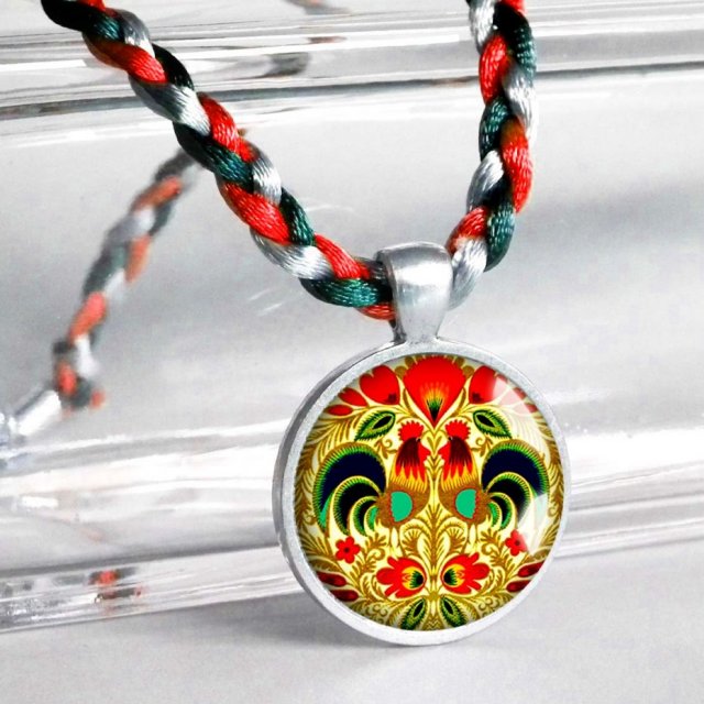 Oryginalny naszyjnik z wisiorem, z motywem grafiki artystycznej pod wypukłym szkłem dającym efekt głębi, w oprawie w kolorze srebra. Wisiorek zawieszony jest na plecionych sznurkach jubilerskich, dopasowanych kolorystycznie do barw grafiki. Obrazek jest bardzo wyraźny, w intensywnych kolorach, wywołany na papierze foto. Szkła z grafiką są unikatowe, wykonane ręcznie według mojego projektu, z dbałością o każdy detal.