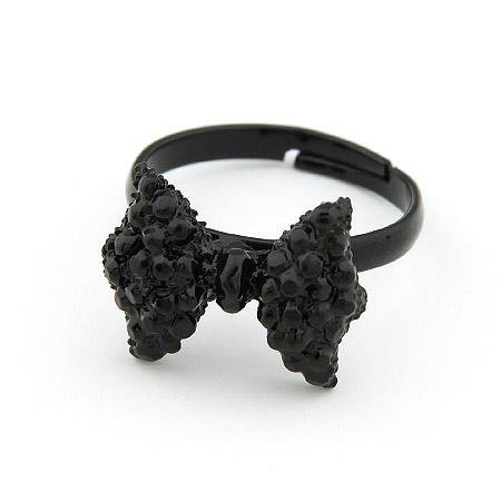 Uroczy pierścionek z czarną kokardką. Jest to produkt nowy, ma możliwość regulacji. Czarne kryształki na powierzchni kokardki nadają subtelny połysk.
