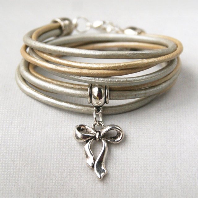 POMYSŁ NA PREZENT ;-) delikatna bransoletka wykonana z 4 rzemieni ze 100% skórki naturalnej w odcieniach metalicznych/perłowych (2 rzemienie 2mm, 2 rzemienie 3mm). zawieszka i wykończenie w kolorze srebrnym. długość regulowana za pomocą łańcuszka. BRANSOLETKA PASUJE NA NADGARSTEK OD 14CM. możesz ją nosić samodzielnie lub dowolnie łączyć z innymi bransoletkami z tej serii. świetnie prezentuje się też w zestawieniu z bransoletkami z kamieni naturalnych. ZOBACZ CAŁĄ KOLEKCJĘ!!! ... MOJA BIŻU ZAWSZE PODRÓŻUJE OZDOBNIE ZAPAKOWANA - opakowanie hand made ;-)