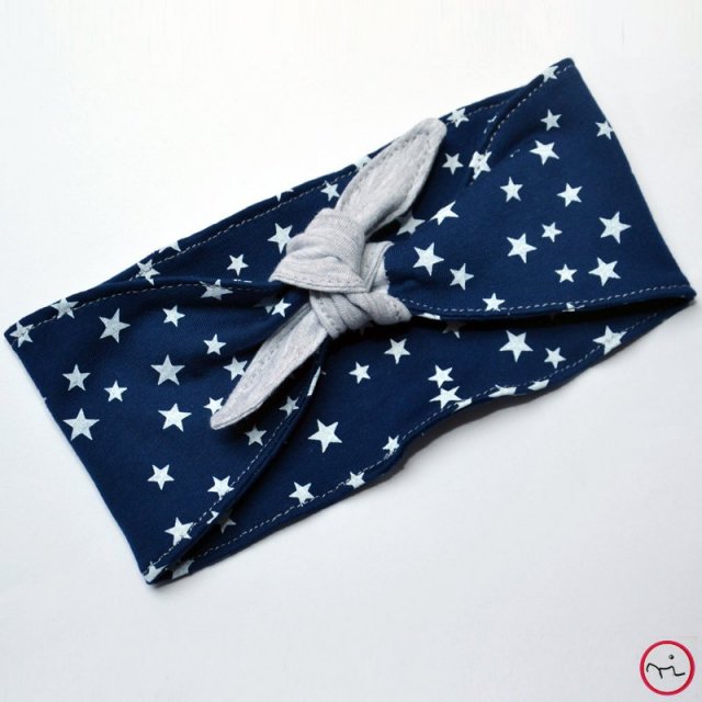 Śliczna kokardka na główkę dla małej księżniczki wykonana została z szarej i granatowej dzianiny w gwiazdki. Opaska szyta na wymiar (w zmówieniu proszę podać obwód główki maluszka).