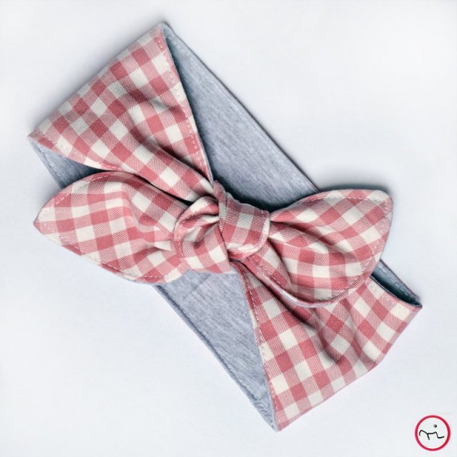 Śliczna kokardka na główkę dla małej księżniczki wykonana została z bawełny w różową kratkę oraz szarej cienkiej dzianinki. Opaska szyta na wymiar (w zmówieniu proszę podać obwód główki maluszka).