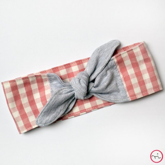 Śliczna kokardka na główkę dla małej księżniczki wykonana została z bawełny w różową kratkę oraz szarej cienkiej dzianinki. Opaska szyta na wymiar (w zmówieniu proszę podać obwód główki maluszka).