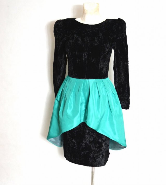 Nowa prześliczna , elegancka sukienka na wyjątkowe okazje i nie tylko. Sukienka wykonana z dwóch rodzajów tkaniny; góra czarna wykonana z materiału podobnego do aksamitu, turkusowo -zielona wierzchnia część wykonana z nieelastycznej, trzymającej formy tkaniny, pod turkusową częścią sukienki, materiał ala aksamit jak w górnej części. Ramiona delikatnie bufiaste, sukienka z tyłu zasuwana na suwak.
