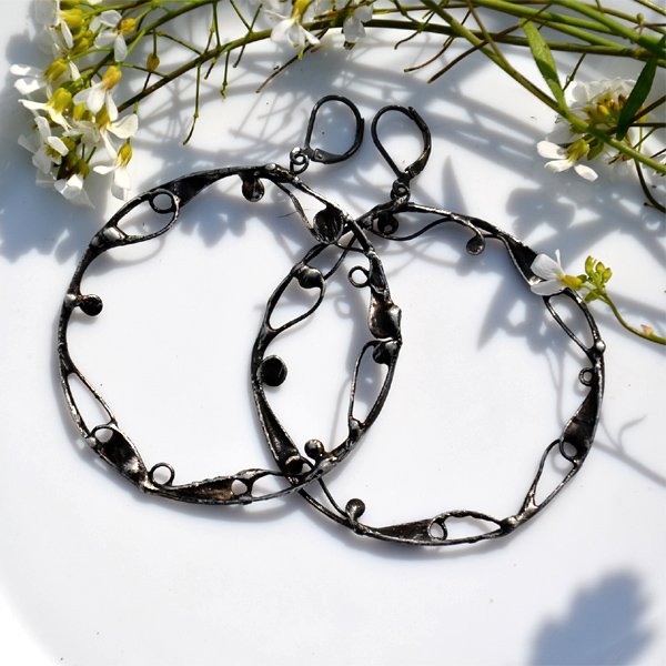 Duże, piękne, bardzo lekkie kolczyki z białymi szkiełkami. Rustykalna ozdobna oprawa w kolorze starego srebra wykonana z miedzi pokrytej ekologiczna cyną. Długość całego kolczyka to ok. 8 cm. Średnica koła to ok. 6 cm. Biżuteria w 100% wykonana ręcznie, poszczególne sztuki mogą się minimalnie różnić.