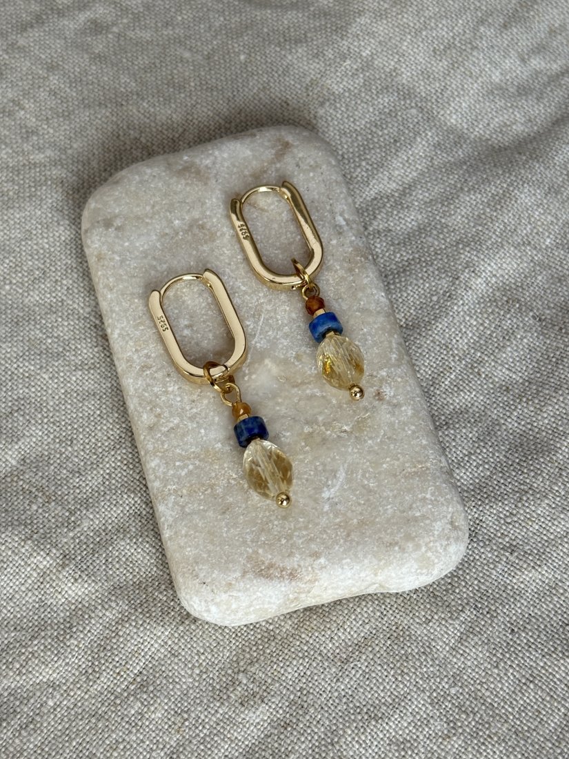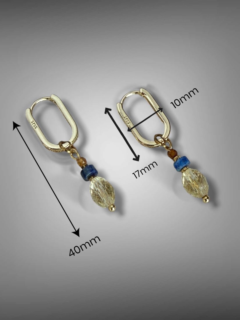 Eleganckie kolczyki z odpinanymi zawieszkami z naturalnych kamieni: chalcedon, perła, szafir, hematyt.