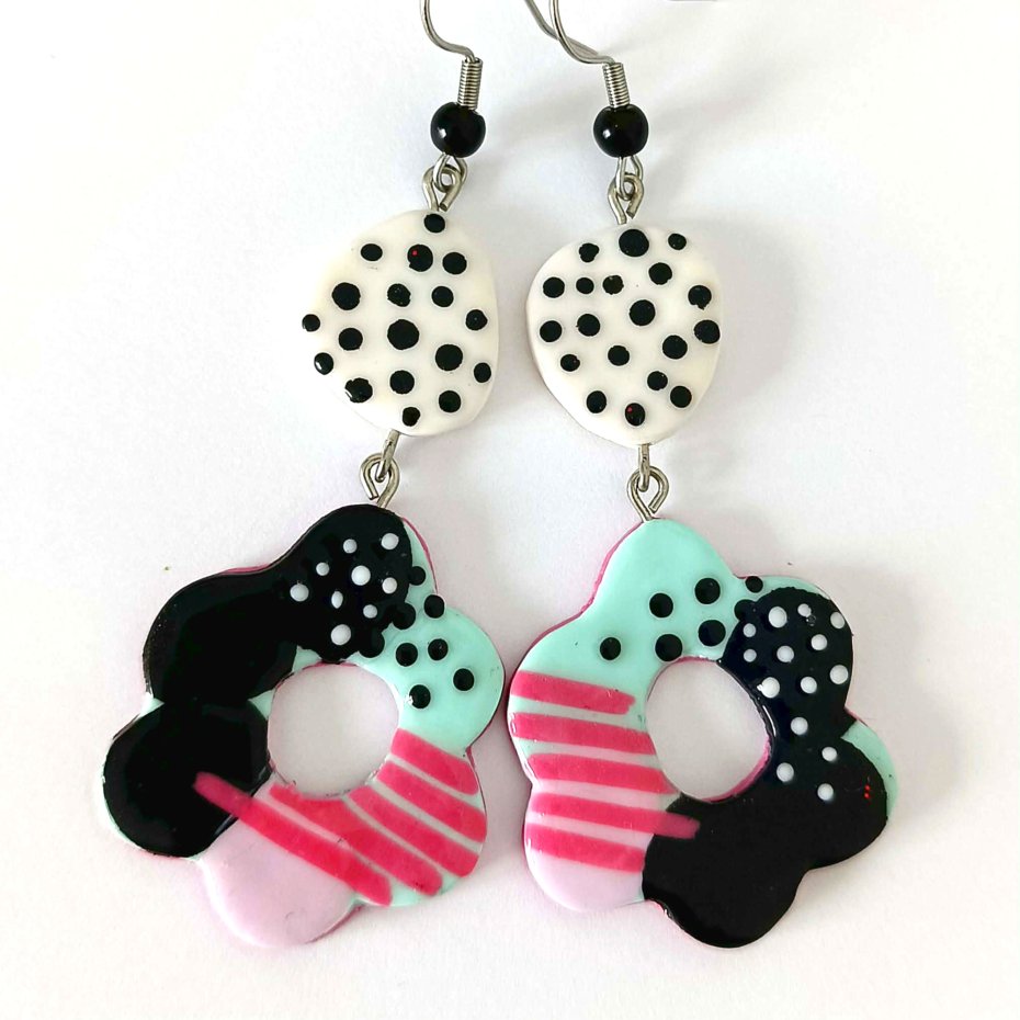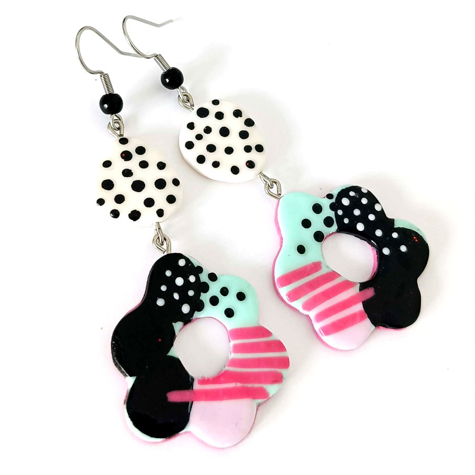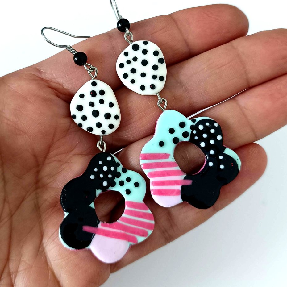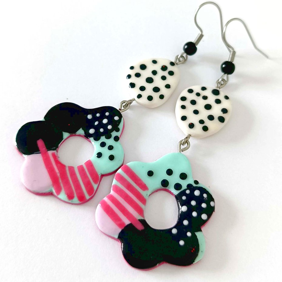 Każdy element został wykonany ręcznie z gliny polimerowej, dzięki czemu kolczyki mają unikalny charakter i niepowtarzalny układ wzorów.
