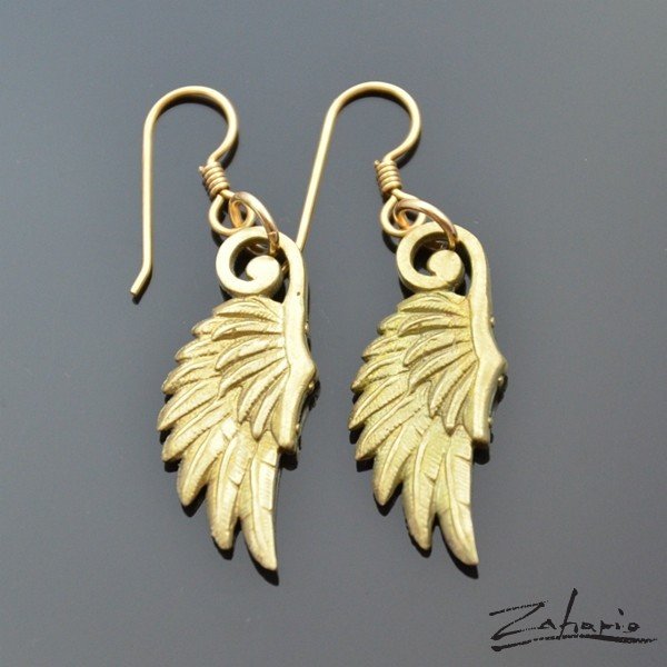 Wyjątkowe kolczyki w kształcie skrzydeł, mocowane na biglach. Kolczyki wykonane w całości ręcznie z brązu.