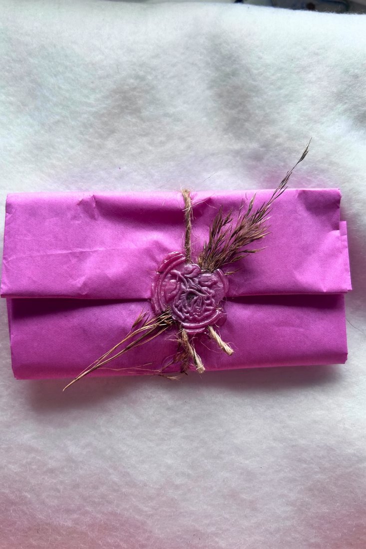 Pakunek przewiązuję jutowym sznurkiem lub elegancką wstążką, a jego front zdobi lakowa pieczęć oraz suszone kwiaty.