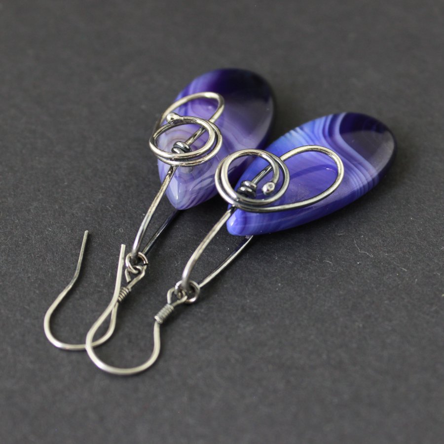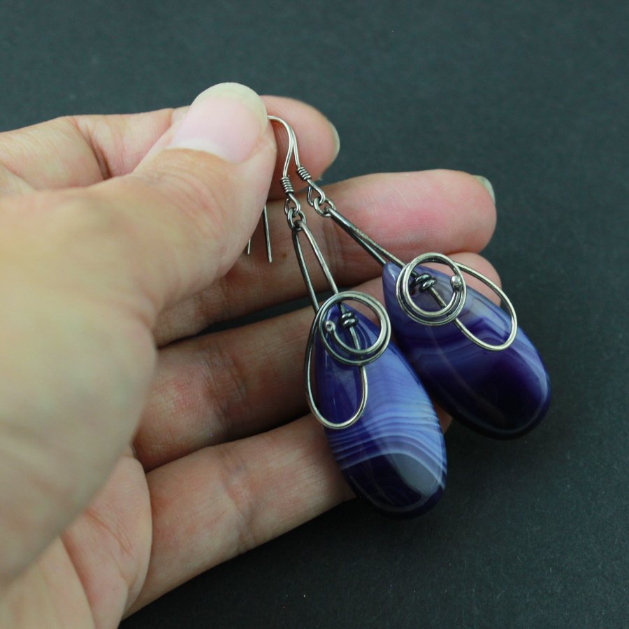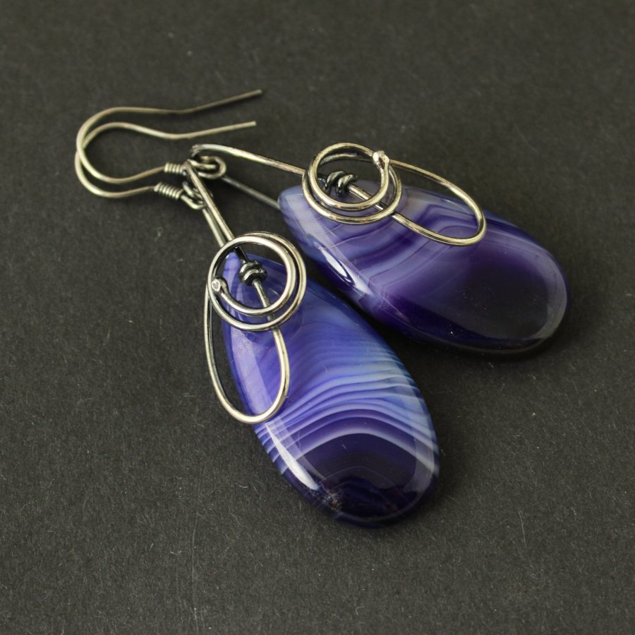 Agat w tych kolczykach układa się w kształt łagodnej kropli, jakby strużka światła zgęstniała i zatrzymała się na moment, pozwalając dostrzec swój wewnętrzny rytm. Na powierzchni kamienia widać subtelne przejścia fioletu: od głębokiego, niemal nocnego granatu, przez półprzezroczyste pasma lawendy, aż po chłodne smugi błękitu. Te warstwy wyglądają jak miniaturowe pejzaże – falujące linie na granicy światła i cienia, zapis drogi, jaką kamień odbył w swoim powolnym, geologicznym tańcu.